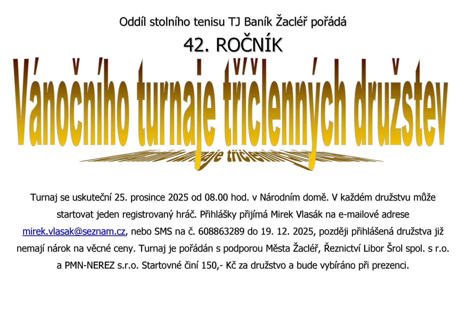 Tradiční vánoční turnaj tříčlenných družstev v Národním domě v Žacléři. V každém družstvu může startovat 1 registrovaný hráč. Přihlášky přijímá M. Vlasák do 19. prosince 2025. Startovné 150,- Kč za družstvo.