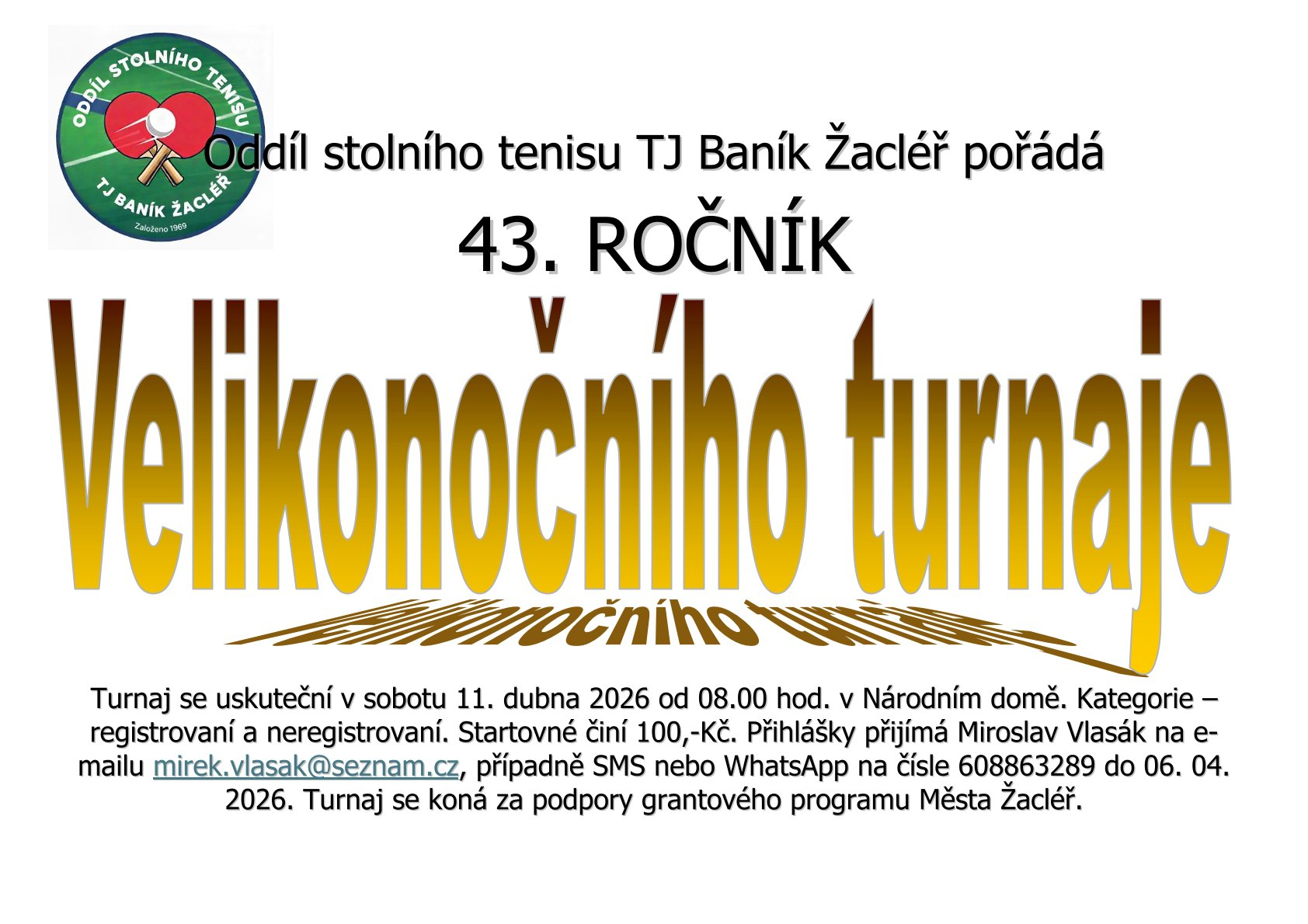 Oddíl stolního tenisu obnovil tradici velikonočních turnajů jednotlivců ve stolním tenise. Přihlášky přijímá Miroslav Vlasák do 6. dubna, startovné činí 100,- kč, v kategoriích registrovaní a neregistrovaní. Turnaj se uskuteční v sobotu 11. dubna 2026.