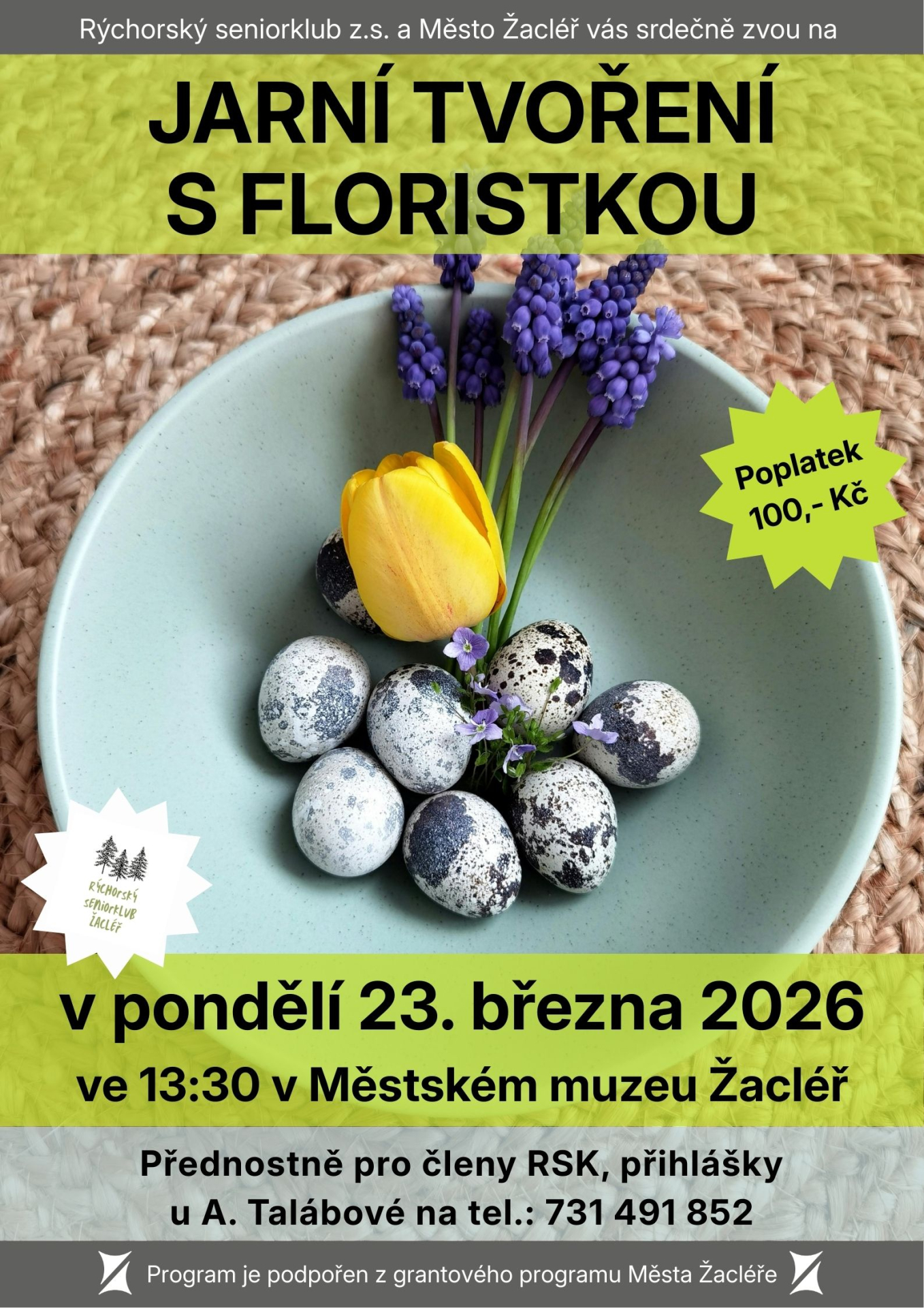 Rýchorský seniorklub Vás srdečně zve na jarní tvoření s floristkou v prostorách muzea v pondělí 23. března v 13,30 h, počet míst je omezen. Poplatek 100,- Kč. Zájemci se mohou hlásit u Anny Talábové na tel.:731 491 852.
