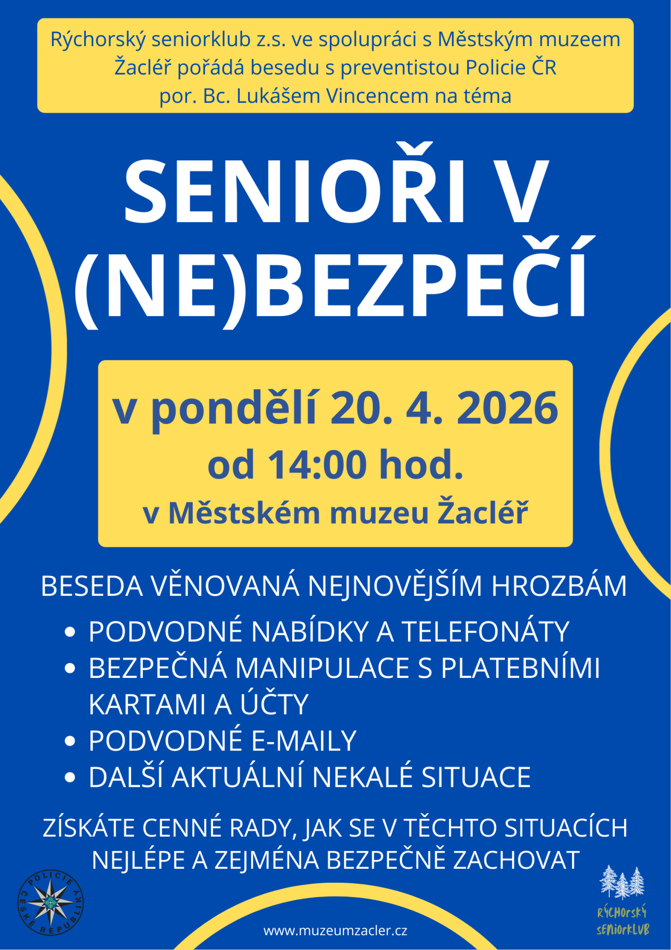 Přijměte pozvání na beseda zaměřenou především na nejnovější hrozby v oblasti podvodných nabídek a telefonátů, na bezpečnou manipulaci s platebními kartami a účty, na podvodné e-maily a další aktuální nekalé situace. V pondělí 20. dubna ve 14 h v Městské muzeu Žacléř.